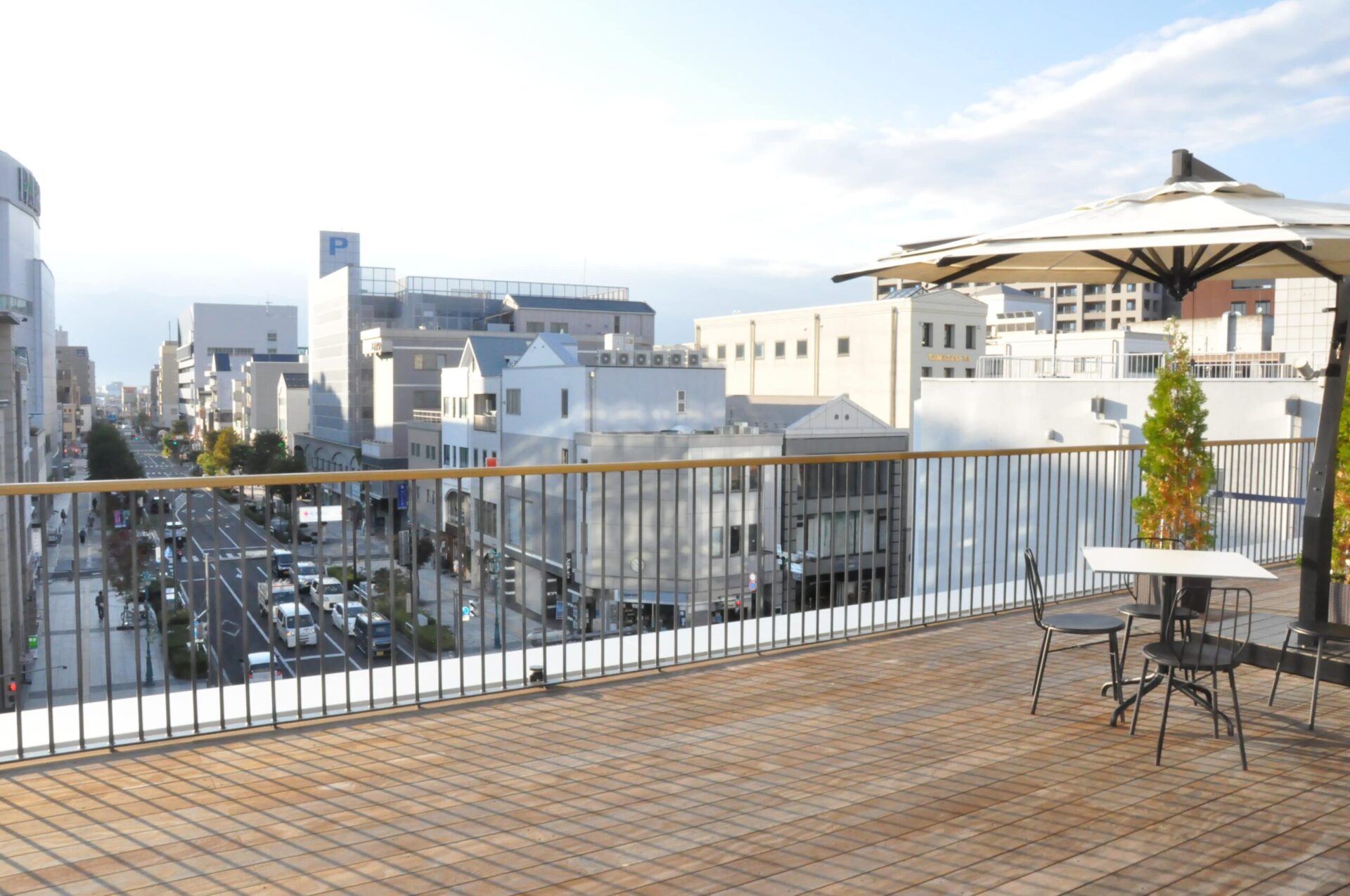 信濃毎日新聞社の新しい松本本社「信毎メディアガーデン」。1〜3階は皆さんにも使っていただけるコミュニティーゾーンと個性豊かな11店舗が入るショップゾーンです。市民の方々をはじめ国内外の観光客も気軽に足を運べる、中心市街地の賑わい創りを目指す複合施設です。